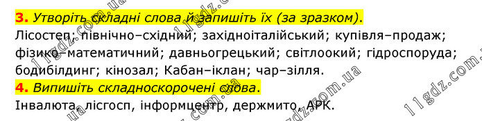 3. Утворіть складні слова й запишіть їх (за зразком). Лісостеп; північно–східний; західноіталійський; купівля–продаж; фізико–математичний; давньогрецький; світлоокий; гідроспоруда; бодибілдинг; кінозал; Кабан–іклан; чар–зілля. 4. Випишіть складноскорочені слова. Інвалюта, лісгосп, інформцентр, держмито, АРК.