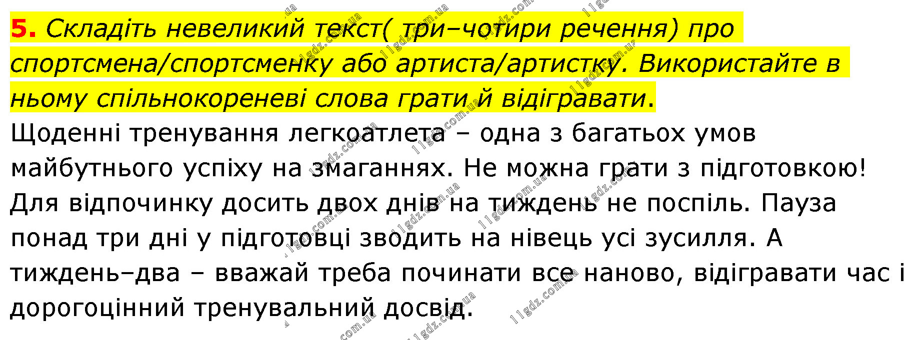 5. Складіть невеликий текст( три–чотири речення) про спортсмена/спортсменку або артиста/артистку. Використайте в ньому спільнокореневі слова грати й відігравати. Щоденні тренування легкоатлета – одна з багатьох умов майбутнього успіху на змаганнях. Не можна грати з підготовкою! Для відпочинку досить двох днів на тиждень не поспіль. Пауза понад три дні у підготовці зводить на нівець усі зусилля. А тиждень–два – вважай треба починати все наново, відігравати час і дорогоцінний тренувальний досвід.