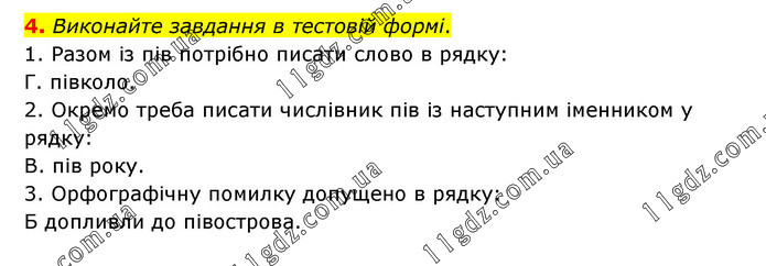 Виконайте завдання в тестовій формі. 1. Разом із пів потрібно писати слово в рядку: Г. півколо. 2. Окремо треба писати числівник пів із наступним іменником у рядку: В. пів року. 3. Орфографічну помилку допущено в рядку: Б допливли до півострова.