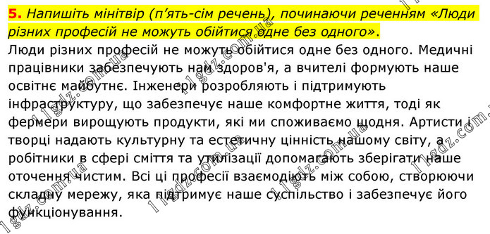 Напишіть мінітвір (п’ять-сім речень), починаючи реченням «Люди різних професій не можуть обійтися одне без одного». Люди різних професій не можуть обійтися одне без одного. Медичні працівники забезпечують нам здоров'я, а вчителі формують наше освітнє майбутнє. Інженери розробляють і підтримують інфраструктуру, що забезпечує наше комфортне життя, тоді як фермери вирощують продукти, які ми споживаємо щодня. Артисти і творці надають культурну та естетичну цінність нашому світу, а робітники в сфері сміття та утилізації допомагають зберігати наше оточення чистим. Всі ці професії взаємодіють між собою, створюючи складну мережу, яка підтримує наше суспільство і забезпечує його функціонування.