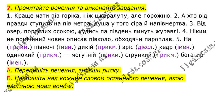 Прочитайте речення та виконайте завдання. 1. Краще мати пів горіха, ніж шкаралупу, але порожню. 2. А хто від правди ступить на пів метра, душа у того сіра й напівмертва. 3. Від озер, порослих осокою, кудись па південь линуть журавлі. 4. Ніким не помічений човен описав півколо, обходячи пароплав. 5. На (прийм.) півночі (імен.) дикій (прикм.) зріс (дієсл.) кедр (імен.) одинокий (прикм.) — могутній (прикм.) стрункий (прикм.) богатир (імен.). А. Перепишіть речення, знявши риску. Б. Надпишіть над кожним словом останнього речення, якою частиною мови воно є.