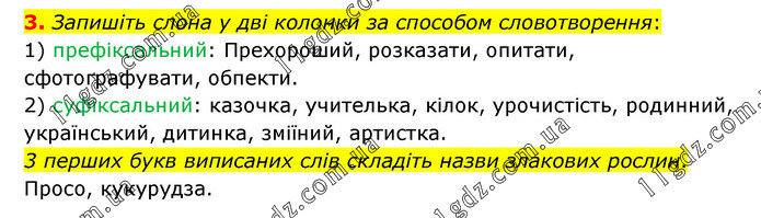 Запишіть слона у дві колонки за способом словотворення: 1) префіксальний: Прехороший, розказати, опитати, сфотографувати, обпекти. 2) суфіксальний: казочка, учителька, кілок, урочистість, родинний, український, дитинка, зміїний, артистка. 3 перших букв виписаних слів складіть назви злакових рослин. Просо, кукурудза.