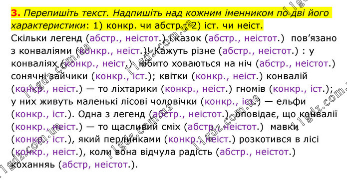 Перепишіть текст. Надпишіть над кожним іменником по дві його характеристики: 1) конкр. чи абстр.; 2) іст. чи неіст. Скільки легенд (абстр., неістот.) і казок (абстр., неістот.) пов’язано з конваліями (конкр., неіст.)! Кажуть різне (абстр., неістот.) : у конваліях (конкр., неіст.) нібито ховаються на ніч (абстр., неістот.) сонячні зайчики (конкр., іст.); квітки (конкр., неіст.) конвалій (конкр., неіст.) — то ліхтарики (конкр., неіст.) гномів (конкр., іст.); у них живуть маленькі лісові чоловічки (конкр., іст.) — ельфи (конкр., іст.). Одна з легенд (абстр., неістот.) оповідає, що конвалії (конкр., неіст.) — то щасливий сміх (абстр., неістот.) мавки (конкр., іст.), який перлинками (конкр., неіст.) розкотився в лісі (конкр., неіст.), коли вона відчула радість (абстр., неістот.) коханняь (абстр, неістот.).