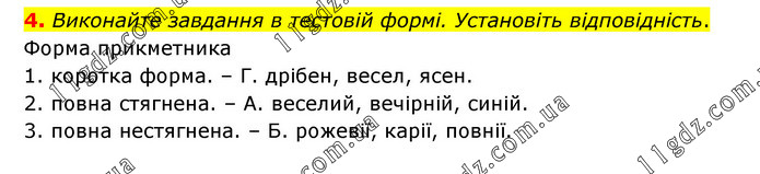 Виконайте завдання в тестовій формі. Установіть відповідність. Форма прикметника 1. коротка форма. – Г. дрібен, весел, ясен. 2. повна стягнена. – А. веселий, вечірній, синій. 3. повна нестягнена. – Б. рожевії, карії, повнії.
