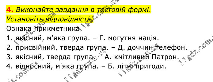 Виконайте завдання в тестовій формі. Установіть відповідність. Ознака прикметника 1. якісний, м'яка група. – Г. могутня нація. 2. присвійний, тверда група. – Д. доччин телефон. 3. якісний, тверда група. – А. кмітливий Патрон. 4. відносний, м'яка група. – Б. літні пригоди.
