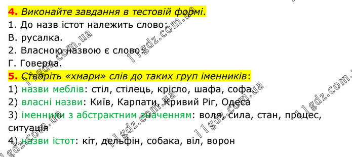 4. Виконайте завдання в тестовій формі. 1. До назв істот належить слово: В. русалка. 2. Власною назвою є слово: Г. Говерла. 5. Створіть «хмари» слів до таких груп іменників: 1) назви меблів: стіл, стілець, крісло, шафа, софа. 2) власні назви: Київ, Карпати, Кривий Ріг, Одеса. 3) іменники з абстрактним значенням: воля, сила, стан, процес, ситуація. 4) назви істот: кіт, дельфін, собака, віл, ворон.