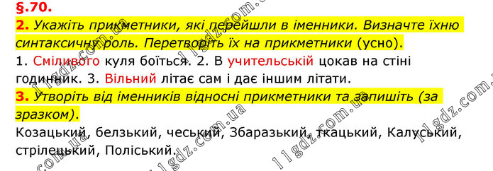 §.70. 2. Укажіть прикметники, які перейшли в іменники. Визначте їхню синтаксичну роль. Перетворіть їх на прикметники (усно). 1. Сміливого куля боїться. 2. В учительській цокав на стіні годинник. 3. Вільний літає сам і дає іншим літати. 3. Утворіть від іменників відносні прикметники та запишіть (за зразком). Козацький, белзький, чеський, Збаразький, ткацький, Калуський, стрілецький, Поліський.