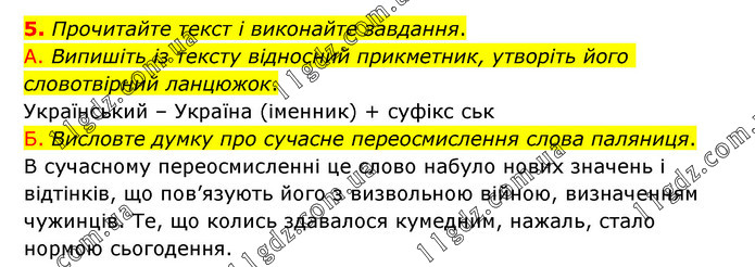 Прочитайте текст і виконайте завдання. А. Випишіть із тексту відносний прикметник, утворіть його словотвірний ланцюжок. Український – Україна (іменник) + суфікс ськ Б. Висловте думку про сучасне переосмислення слова паляниця. В сучасному переосмисленні це слово набуло нових значень і відтінків, що пов’язують його з визвольною війною, визначенням чужинців. Те, що колись здавалося кумедним, нажаль, стало нормою сьогодення.