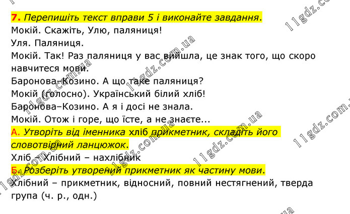Перепишіть текст вправи 5 і виконайте завдання. Мокій. Скажіть, Улю, паляниця! Уля. Паляниця. Мокій. Так! Раз паляниця у вас вийшла, це знак того, що скоро навчитеся мови. Баронова–Козино. А що таке паляниця? Мокій (голосно). Український білий хліб! Баронова–Козино. А я і досі не знала. Мокій. Отож і горе, що їсте, а не знаєте... А. Утворіть від іменника хліб прикметник, складіть його словотвірний ланцюжок. Хліб – Хлібний – нахлібник Б. Розберіть утворений прикметник як частину мови. Хлібний – прикметник, відносний, повний нестягнений, тверда група (ч. р., одн.)