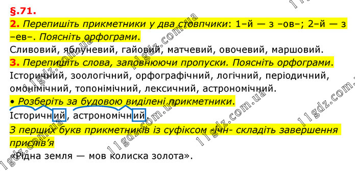 §.71. 2. Перепишіть прикметники у два стовпчики: 1–й — з –ов–; 2–й — з –ев–. Поясніть орфограми. Сливовий, яблуневий, гайовий, матчевий, овочевий, маршовий. 3. Перепишіть слова, заповнюючи пропуски. Поясніть орфограми. Історичний, зоологічний, орфографічний, логічний, періодичний, омонімічний, топонімічний, лексичний, астрономічний. • Розберіть за будовою виділені прикметники. Історичний, астрономічний. З перших букв прикметників із суфіксом -ічн- складіть завершення прислів’я «Рідна земля — мов колиска золота».