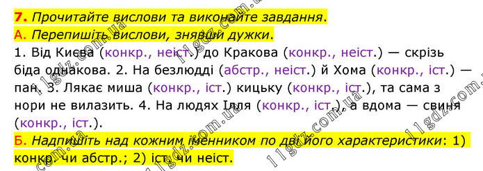 Прочитайте вислови та виконайте завдання. А. Перепишіть вислови, знявши дужки. 1. Від Києва (конкр., неіст.) до Кракова (конкр., неіст.) — скрізь біда однакова. 2. На безлюдді (абстр., неіст.) й Хома (конкр., іст.) — пан. 3. Лякає миша (конкр., іст.) кицьку (конкр., іст.), та сама з нори не вилазить. 4. На людях Ілля (конкр., іст.), а вдома — свиня (конкр., іст.). Б. Надпишіть над кожним іменником по дві його характеристики: 1) конкр. чи абстр.; 2) іст. чи неіст.
