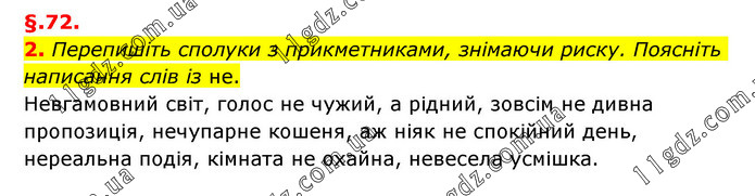 §.72. 2. Перепишіть сполуки з прикметниками, знімаючи риску. Поясніть написання слів із не. Невгамовний світ, голос не чужий, а рідний, зовсім не дивна пропозиція, нечупарне кошеня, аж ніяк не спокійний день, нереальна подія, кімната не охайна, невесела усмішка.