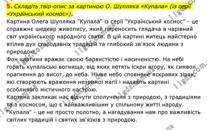Складіть твір-опис за картиною О. Шупляка «Купала» (із серії «Український космос»). Картина Олега Шупляка "Купала" із серії "Український космос" - це справжнє шедевр живопису, який переносить глядача в чарівний світ українського народного свята. В цій картині митець майстерно втілив дух стародавніх традицій та глибокий зв'язок людини з природою. Фон картини вражає своєю барвистістю і насиченістю. На небі горять купальські вогнища, від яких летять іскри вгору, як символ прагнення до висот, до неба. Нічне небо сповнене яскравих зірок, які створюють враження незримої магії і надають картині особливого містичного настрою. Картина закликає нас відчути сполучення з природою, з традиціями та з космосом, що є найважливішим у спільному житті народу. "Купала" - це не просто полотно, а нагадування нам про важливість світлих традицій і святих зв'язків з природою.