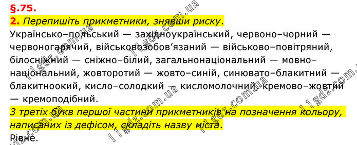 §.75. 2. Перепишіть прикметники, знявши риску. Українсько–польський — західноукраїнський, червоно–чорний — червоногарячий, військовозобов’язаний — військово–повітряний, білосніжний — сніжно–білий, загальнонаціональний — мовно–національний, жовторотий — жовто–синій, синювато–блакитний — блакитноокий, кисло–солодкий — кисломолочний, кремово–жовтий — кремоподібний. 3 третіх букв першої частини прикметників на позначення кольору, написаних із дефісом, складіть назву міста. Рівне.