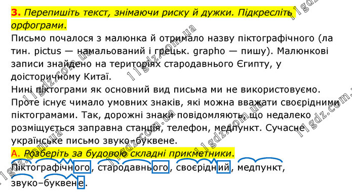 3. Перепишіть текст, знімаючи риску й дужки. Підкресліть орфограми. Письмо почалося з малюнка й отримало назву піктографічного (ла тин. pictus — намальований і грецьк. grapho — пишу). Малюнкові записи знайдено на територіях стародавнього Єгипту, у доісторичному Китаї. Нині піктограми як основний вид письма ми не використовуємо. Проте існує чимало умовних знаків, які можна вважати своєрідними піктограмами. Так, дорожні знаки повідомляють, що недалеко розміщується заправна станція, телефон, медпункт. Сучасне українське письмо звуко–буквене. А. Розберіть за будовою складні прикметники. Піктографічного, стародавнього, своєрідний, медпункт, звуко–буквене.