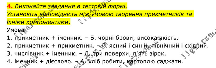 Виконайте завдання в тестовій формі. Установіть відповідність між умовою творення прикметників та їхніми компонентами. Умова 1. прикметник + іменник. – Б. чорні брови, висока якість. 2. прикметник + прикметник. – Г. ясний і синій, північний і східний. 3. числівник + іменник. – Д. три поверхи, п'ять зірок. 4. іменник + дієслово. – А. хліб робити, картоплю саджати.