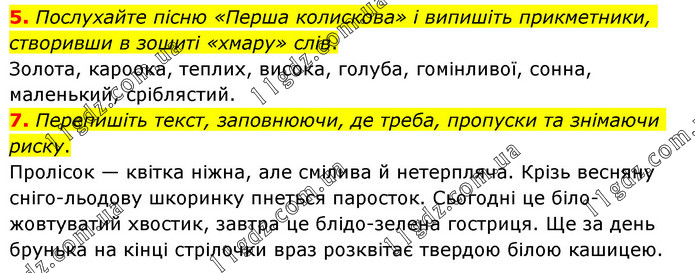 5. Послухайте пісню «Перша колискова» і випишіть прикметники, створивши в зошиті «хмару» слів. Золота, кароока, теплих, висока, голуба, гомінливої, сонна, маленький, сріблястий. 7. Перепишіть текст, заповнюючи, де треба, пропуски та знімаючи риску. Пролісок — квітка ніжна, але смілива й нетерпляча. Крізь весняну сніго-льодову шкоринку пнеться паросток. Сьогодні це біло-жовтуватий хвостик, завтра це блідо-зелена гостриця. Ще за день брунька на кінці стрілочки враз розквітає твердою білою кашицею.