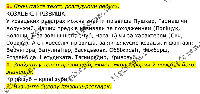 3. Прочитайте текст, розгадуючи ребуси. КОЗАЦЬКІ ПРІЗВИЩА. У козацьких реєстрах можна знайти прізвища Пушкар, Гармаш чи Хорунжий. Наших предків називали за походженням (Поліщук, Волошин), за зовнішністю (Чуб, Носань) чи за характером (Сич, Сорока). А є і «веселі» прізвища, за які дякуємо козацькій фантазії: Вернигора, Затуливітер, Засядьвовк, Оббіжисвіт, Ніїжборщ, Роздайбіда, Нетудихата, Тягнирядно, Кривозуб. А. Знайдіть у тексті прізвище прикметникової форми й поясніть його значення. Кривозуб – криві зуби. Б. Визначте будову прізвищ-розгадок.