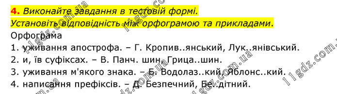 Виконайте завдання в тестовій формі. Установіть відповідність між орфограмою та прикладами. Орфограма 1. уживання апострофа. – Г. Кропив..янський, Лук..янівський. 2. и, їв суфіксах. – В. Панч. шин, Грица..шин. 3. уживання м'якого знака. – Б. Водолаз..кий, Яблонс..кий. 4. написання префіксів. – Д. Безпечний, Бе..дітний.