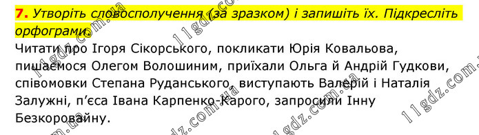 Утворіть словосполучення (за зразком) і запишіть їх. Підкресліть орфограми. Читати про Ігоря Сікорського, покликати Юрія Ковальова, пишаємося Олегом Волошиним, приїхали Ольга й Андрій Гудкови, співомовки Степана Руданського, виступають Валерій і Наталія Залужні, п’єса Івана Карпенко-Карого, запросили Інну Безкоровайну.