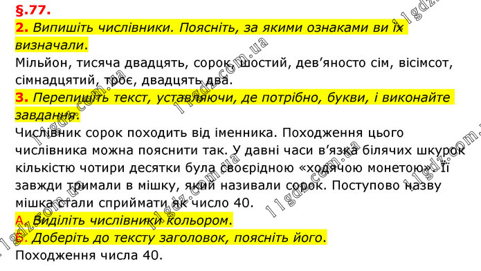 §.77. 2. Випишіть числівники. Поясніть, за якими ознаками ви їх визначали. Мільйон, тисяча двадцять, сорок, шостий, дев’яносто сім, вісімсот, сімнадцятий, троє, двадцять два. 3. Перепишіть текст, уставляючи, де потрібно, букви, і виконайте завдання. Числівник сорок походить від іменника. Походження цього числівника можна пояснити так. У давні часи в’язка білячих шкурок кількістю чотири десятки була своєрідною «ходячою монетою». Її завжди тримали в мішку, який називали сорок. Поступово назву мішка стали сприймати як число 40. А. Виділіть числівники кольором. Б. Доберіть до тексту заголовок, поясніть його. Походження числа 40.