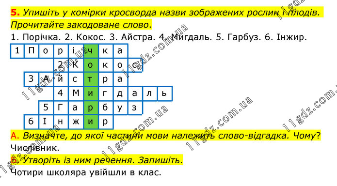 Упишіть у комірки кросворда назви зображених рослин і плодів. Прочитайте закодоване слово. 1. Порічка. 2. Кокос. 3. Айстра. 4. Мигдаль. 5. Гарбуз. 6. Інжир. А. Визначте, до якої частини мови належить слово-відгадка. Чому? Числівник. Б. Утворіть із ним речення. Запишіть. Чотири школяра увійшли в клас.