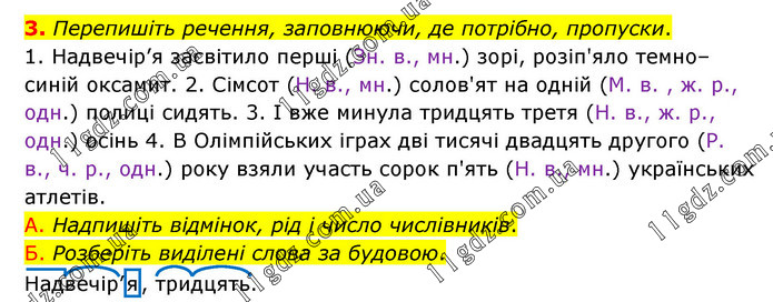 Перепишіть речення, заповнюючи, де потрібно, пропуски. 1. Надвечір’я засвітило перші (Зн. в., мн.) зорі, розіп'яло темно–синій оксамит. 2. Сімсот (Н. в., мн.) солов'ят на одній (М. в. , ж. р., одн.) полиці сидять. 3. І вже минула тридцять третя (Н. в., ж. р., одн.) осінь 4. В Олімпійських іграх дві тисячі двадцять другого (Р. в., ч. р., одн.) року взяли участь сорок п'ять (Н. в., мн.) українських атлетів. А. Надпишіть відмінок, рід і число числівників. Б. Розберіть виділені слова за будовою. Надвечір’я, тридцять.