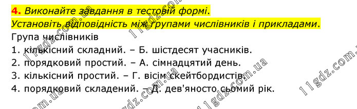 Виконайте завдання в тестовій формі. Установіть відповідність між групами числівників і прикладами. Група числівників 1. кількісний складний. – Б. шістдесят учасників. 2. порядковий простий. – А. сімнадцятий день. 3. кількісний простий. – Г. вісім скейтбордистів. 4. порядковий складений. – Д. дев'яносто сьомий рік.