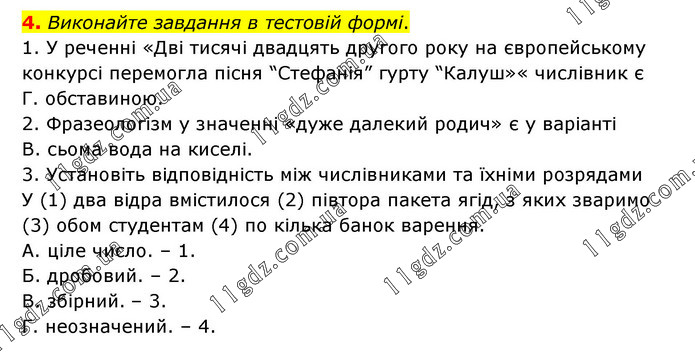 Виконайте завдання в тестовій формі. 1. У реченні «Дві тисячі двадцять другого року на європейському конкурсі перемогла пісня “Стефанія” гурту “Калуш»« числівник є Г. обставиною. 2. Фразеологізм у значенні «дуже далекий родич» є у варіанті В. сьома вода на киселі. 3. Установіть відповідність між числівниками та їхніми розрядами У (1) два відра вмістилося (2) півтора пакета ягід, з яких зваримо (3) обом студентам (4) по кілька банок варення. А. ціле число. – 1. Б. дробовий. – 2. В. збірний. – 3. Г. неозначений. – 4.
