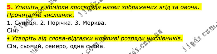 Упишіть у комірки кросворда назви зображених ягід та овоча. Прочитайте числівник. 1. Суниця. 2. Порічка. 3. Морква. Сім. • Утворіть від слова-відгадки можливі розряди числівників. Сім, сьомий, семеро, одна сьома.