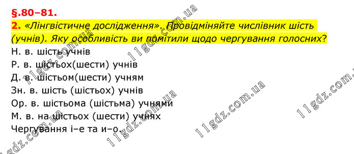§.80–81. 2. «Лінгвістичне дослідження». Провідміняйте числівник шість (учнів). Яку особливість ви помітили щодо чергування голосних? Н. в. шість учнів Р. в. шістьох(шести) учнів Д. в. шістьом(шести) учням Зн. в. шість (шістьох) учнів Ор. в. шістьома (шістьма) учнями М. в. на шістьох (шести) учнях Чергування і–е та и–о.