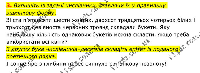 Випишіть із задачі числівники, ставлячи їх у правильну відмінкову форму. Зі ста п’ятдесяти шести жовтих, двохсот тридцятьох чотирьох білих і трьохсот дев'яноста червоних троянд складали букети. Яку найбільшу кількість однакових букетів можна скласти, якщо треба використати всі квіти? 3 других букв числівників–десятків складіть епітет із поданого поетичного рядка. І сонце яре з глибини небес сипнуло світанкову позолоту!