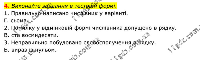 Виконайте завдання в тестовій формі. 1. Правильно написано числівник у варіанті. Г. сьома. 2. Помилку у відмінковій формі числівника допущено в рядку. В. ста восмидесяти. 3. Неправильно побудовано словосполучення в рядку. Б. вираз із нульом.