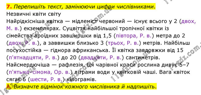 Перепишіть текст, замінюючи цифри числівниками. Незвичні квіти світу Найрідкісніша квітка — мідлеміст червоний — існує всього у 2 (двох, М. в.) екземплярах. Суцвіття найбільшої тропічної квітки із сімейства ароїдних завширшки від 1,5 (півтора, Р. в.) метра до 2 (двох, Р. в.), а заввишки близько 3 (трьох, Р. в.) метрів. Найбільш посухостійка — гіднора африканська. Її квітка завдовжки від 15 (п'ятнадцяти, Р. в.) до 20 (двадцяти, Р. в.) сантиметрів. Найсмердючіша — рафлезія. Ця чарівної краси рослина дивує 5–7 (п'ятьма–сімома, Ор. в.) літрами води у квітковій чаші. Вага квіток сягає 6 (шести, Р. в.) кілограмів. А. Визначте відмінок кожного числівника й надпишіть.