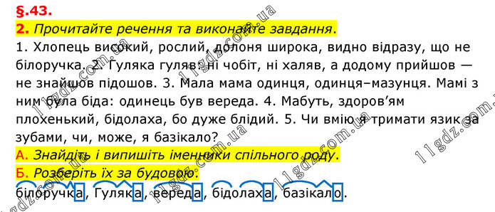 §.43. 2. Прочитайте речення та виконайте завдання. 1. Хлопець високий, рослий, долоня широка, видно відразу, що не білоручка. 2. Гуляка гуляв: ні чобіт, ні халяв, а додому прийшов — не знайшов підошов. 3. Мала мама одинця, одинця–мазунця. Мамі з ним була біда: одинець був вереда. 4. Мабуть, здоров’ям плохенький, бідолаха, бо дуже блідий. 5. Чи вмію я тримати язик за зубами, чи, може, я базікало? А. Знайдіть і випишіть іменники спільного роду. Б. Розберіть їх за будовою. білоручка, Гуляка, вереда, бідолаха, базікало.