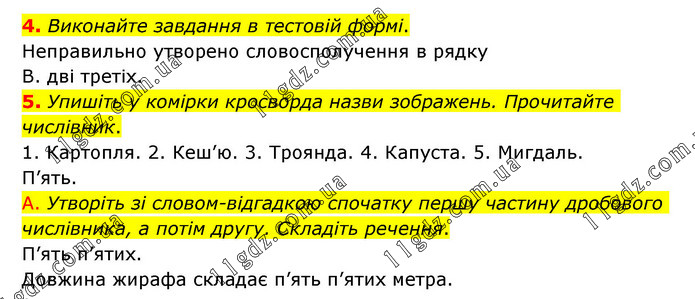 4. Виконайте завдання в тестовій формі. Неправильно утворено словосполучення в рядку В. дві третіх. 5. Упишіть у комірки кросворда назви зображень. Прочитайте числівник. 1. Картопля. 2. Кеш’ю. 3. Троянда. 4. Капуста. 5. Мигдаль. П’ять. А. Утворіть зі словом-відгадкою спочатку першу частину дробового числівника, а потім другу. Складіть речення. П’ять п’ятих. Довжина жирафа складає п’ять п’ятих метра.
