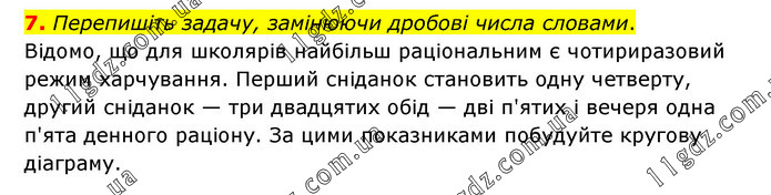 Перепишіть задачу, замінюючи дробові числа словами. Відомо, що для школярів найбільш раціональним є чотириразовий режим харчування. Перший сніданок становить одну четверту, другий сніданок — три двадцятих обід — дві п'ятих і вечеря одна п'ята денного раціону. За цими показниками побудуйте кругову діаграму.