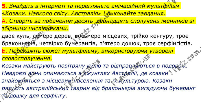 Знайдіть в інтернеті та перегляньте анімаційний мультфільм «Козаки. Навколо світу. Австралія» і виконайте завдання. А. Створіть за побаченим десять–дванадцять сполучень іменників зі збірними числівниками. двоє куль, семеро дерев, восьмеро місцевих, трійко кенгуру, троє браконьєрів, четвірко бумерангів, п'ятеро дошок, троє серфінгістів. Б. Перекажіть сюжет мультфільму, використовуючи утворені словосполучення. Козаки майструють повітряну кулю та відправляються в подорож. Невдовзі вони опиняються в джунглях Австралії, де козаки знайомляться з місцевим населення та їх культурою. Козаки рятують австралійських тварин від браконьєрів вигадуючи бумеранг та дошку для серфінгу.