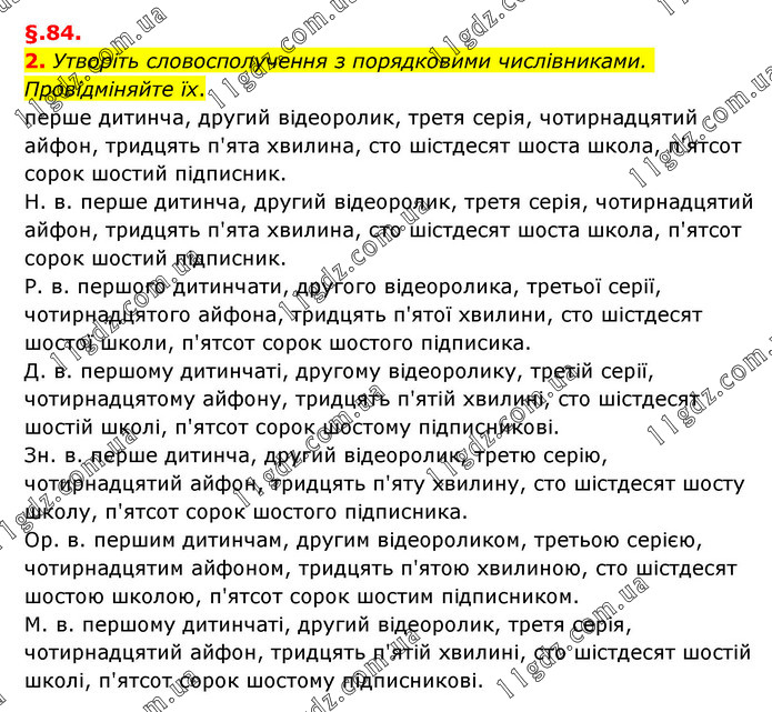 §.84. 2. Утворіть словосполучення з порядковими числівниками. Провідміняйте їх. перше дитинча, другий відеоролик, третя серія, чотирнадцятий айфон, тридцять п'ята хвилина, сто шістдесят шоста школа, п'ятсот сорок шостий підписник. Н. в. перше дитинча, другий відеоролик, третя серія, чотирнадцятий айфон, тридцять п'ята хвилина, сто шістдесят шоста школа, п'ятсот сорок шостий підписник. Р. в. першого дитинчати, другого відеоролика, третьої серії, чотирнадцятого айфона, тридцять п'ятої хвилини, сто шістдесят шостої школи, п'ятсот сорок шостого підписика. Д. в. першому дитинчаті, другому відеоролику, третій серії, чотирнадцятому айфону, тридцять п'ятій хвилині, сто шістдесят шостій школі, п'ятсот сорок шостому підписникові. Зн. в. перше дитинча, другий відеоролик, третю серію, чотирнадцятий айфон, тридцять п'яту хвилину, сто шістдесят шосту школу, п'ятсот сорок шостого підписника. Ор. в. першим дитинчам, другим відеороликом, третьою серією, чотирнадцятим айфоном, тридцять п'ятою хвилиною, сто шістдесят шостою школою, п'ятсот сорок шостим підписником. М. в. першому дитинчаті, другий відеоролик, третя серія, чотирнадцятий айфон, тридцять п'ятій хвилині, сто шістдесят шостій школі, п'ятсот сорок шостому підписникові.
