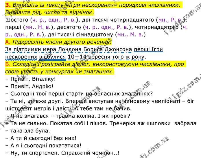 Випишіть із тексту «Ігри нескорених» порядкові числівники. Визначте рід, число та відмінок. Шостого (ч. р., одн., Р. в.), дві тисячі чотирнадцятого (мн., Р. в.), перші (мн., Н. в.), десятого (ч. р., одн., Р. в.), чотирнадцятого (ч. р., одн., Р. в.), дві тисячі сімнадцятому (мн., М. в.) А. Підкресліть члени другого речення. За підтримки мера Лондона Бориса Джонсона перші Ігри нескорених відбулися 10—14 вересня того ж року. Б. Складіть і розіграйте діалог, використовуючи числівники, про свою участь у конкурсах чи змаганнях. – Привіт, Віталіку! – Привіт, Андрію! – Сьогодні твої перші старти на обласних змаганнях? – Та ні, це вже другі. Вперше виступав на зимовому чемпіонаті – біг шістдесят метрів і двісті. А тебе там не бачив. – Я не змагався – травма коліна. І як пробіг? – Та не сильно. Покатав собі і пішов. Тренерка аж шиповки забрала – така зла була. – А ти й сьогодні без них! – А я і сьогодні покататися! – Ну, ти спортсмен. Справжній чемпіон..!