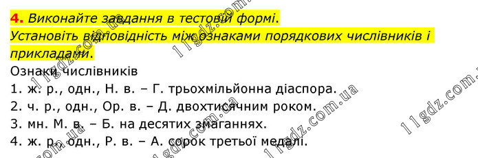 Виконайте завдання в тестовій формі. Установіть відповідність між ознаками порядкових числівників і прикладами. Ознаки числівників 1. ж. р., одн., Н. в. – Г. трьохмільйонна діаспора. 2. ч. р., одн., Ор. в. – Д. двохтисячним роком. 3. мн. М. в. – Б. на десятих змаганнях. 4. ж. р., одн., Р. в. – А. сорок третьої медалі.