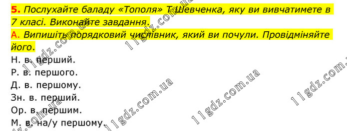 Послухайте баладу «Тополя» Т Шевченка, яку ви вивчатимете в 7 класі. Виконайте завдання. А. Випишіть порядковий числівник, який ви почули. Провідміняйте його. Н. в. перший. Р. в. першого. Д. в. першому. Зн. в. перший. Ор. в. першим. М. в. на/у першому.