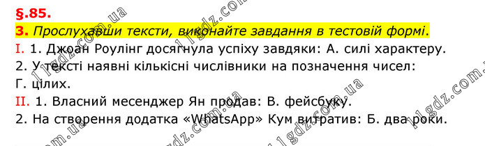 §.85. 3. Прослухавши тексти, виконайте завдання в тестовій формі. І. 1. Джоан Роулінг досягнула успіху завдяки: А. силі характеру. 2. У тексті наявні кількісні числівники на позначення чисел: Г. цілих. ІІ. 1. Власний месенджер Ян продав: В. фейсбуку. 2. На створення додатка «WhatsАрр» Кум витратив: Б. два роки.