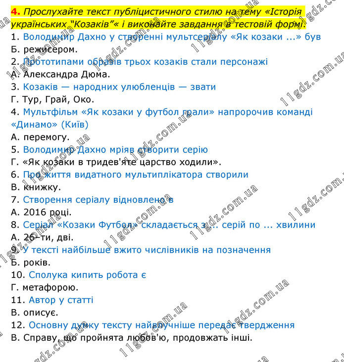 Прослухайте текст публіцистичного стилю на тему «Історія українських “Козаків”« і виконайте завдання в тестовій формі. 1. Володимир Дахно у створенні мультсеріалу «Як козаки ...» був Б. режисером. 2. Прототипами образів трьох козаків стали персонажі А. Александра Дюма. 3. Козаків — народних улюбленців — звати Г. Тур, Грай, Око. 4. Мультфільм «Як козаки у футбол грали» напророчив команді «Динамо» (Київ) А. перемогу. 5. Володимир Дахно мріяв створити серію Г. «Як козаки в тридев'яте царство ходили». 6. Про життя видатного мультиплікатора створили В. книжку. 7. Створення серіалу відновлено в А. 2016 році. 8. Серіал «Козаки Футбол» складається з ... серій по ... хвилини А. 26–ти, дві. 9. У тексті найбільше вжито числівників на позначення Б. років. 10. Сполука кипить робота є Г. метафорою. 11. Автор у статті В. описує. 12. Основну думку тексту найвлучніше передає твердження В. Справу, що пройнята любов'ю, продовжать інші.