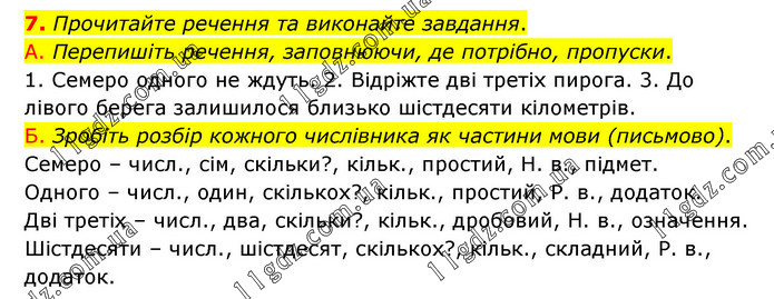 Прочитайте речення та виконайте завдання. А. Перепишіть речення, заповнюючи, де потрібно, пропуски. 1. Семеро одного не ждуть. 2. Відріжте дві третіх пирога. 3. До лівого берега залишилося близько шістдесяти кілометрів. Б. Зробіть розбір кожного числівника як частини мови (письмово). Семеро – числ., сім, скільки?, кільк., простий, Н. в., підмет. Одного – числ., один, скількох?, кільк., простий, Р. в., додаток. Дві третіх – числ., два, скільки?, кільк., дробовий, Н. в., означення. Шістдесяти – числ., шістдесят, скількох?, кільк., складний, Р. в., додаток.