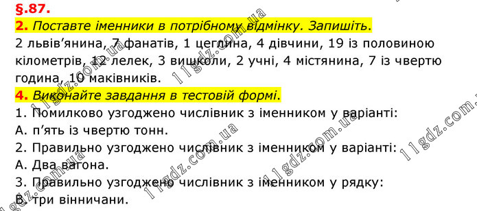 §.87. 2. Поставте іменники в потрібному відмінку. Запишіть. 2 львів’янина, 7 фанатів, 1 цеглина, 4 дівчини, 19 із половиною кілометрів, 12 лелек, 3 вишколи, 2 учні, 4 містянина, 7 із чвертю година, 10 маківників. 4. Виконайте завдання в тестовій формі. 1. Помилково узгоджено числівник з іменником у варіанті: А. п’ять із чвертю тонн. 2. Правильно узгоджено числівник з іменником у варіанті: А. Два вагона. 3. Правильно узгоджено числівник з іменником у рядку: В. три вінничани.