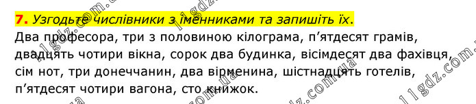 Узгодьте числівники з іменниками та запишіть їх. Два професора, три з половиною кілограма, п’ятдесят грамів, двадцять чотири вікна, сорок два будинка, вісімдесят два фахівця, сім нот, три донеччанин, два вірменина, шістнадцять готелів, п’ятдесят чотири вагона, сто книжок.