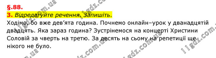 §.88. 3. Відредагуйте речення. Запишіть. Ходімо, бо вже дев’ята година. Почнемо онлайн–урок у дванадцятій двадцять. Яка зараз година? Зустрінемося на концерті Христини Соловій за чверть на третю. За десять на сьому на репетиції ще нікого не було.