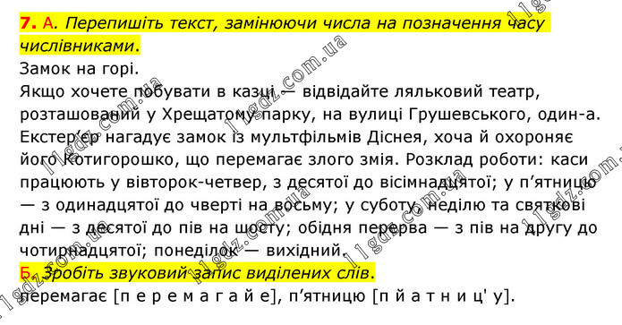 А. Перепишіть текст, замінюючи числа на позначення часу числівниками. Замок на горі. Якщо хочете побувати в казці — відвідайте ляльковий театр, розташований у Хрещатому парку, на вулиці Грушевського, один-а. Екстер’єр нагадує замок із мультфільмів Діснея, хоча й охороняє його Котигорошко, що перемагає злого змія. Розклад роботи: каси працюють у вівторок-четвер, з десятої до вісімнадцятої; у п’ятницю — з одинадцятої до чверті на восьму; у суботу, неділю та святкові дні — з десятої до пів на шосту; обідня перерва — з пів на другу до чотирнадцятої; понеділок — вихідний. Б. Зробіть звуковий запис виділених слів. перемагає [п е р е м а г а й е], п’ятницю [п й а т н и ц' у].