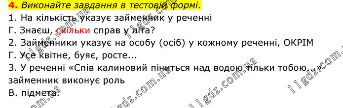 Виконайте завдання в тестовій формі. 1. На кількість указує займенник у реченні. Г. Знаєш, скільки справ у літа? 2. Займенники указує на особу (осіб) у кожному реченні, ОКРІМ. Г. Усе квітне, буяє, росте... 3. У реченні «Спів калиновий піниться над водою тільки тобою...» займенник виконує роль. В. підмета.